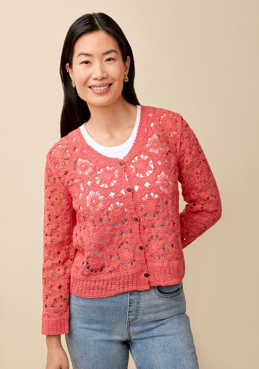 Elevate your layering options with our Button Up Crochet Cardigan. This easygoing, relaxed fit cardigan sits away from the body and is designed to fall at the hip. Made from a soft, breathable, and lightweight cotton knit, it features a flattering V-neck and long sleeves. The open-knit crochet design showcases intricate floral motifs on the front and sleeves, while the back combines crochet and ribbed knitting for a unique touch. Perfect for adding a delicate layer to your look!